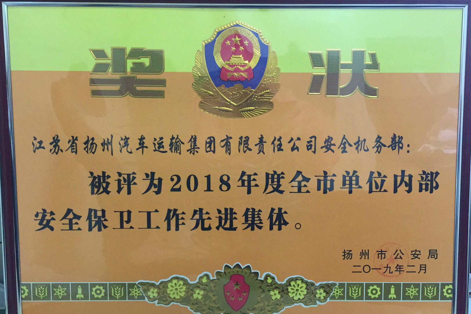 近日,揚(yáng)汽集團(tuán)獲揚(yáng)州市公安局表彰,集團(tuán)安全機(jī)務(wù)部被評(píng)為2018年度全市單位內(nèi)部安全保衛(wèi)工作先進(jìn)集體,馬繼賢被評(píng)為2018年度全市單位內(nèi)部安全保衛(wèi)工作先進(jìn)個(gè)人。