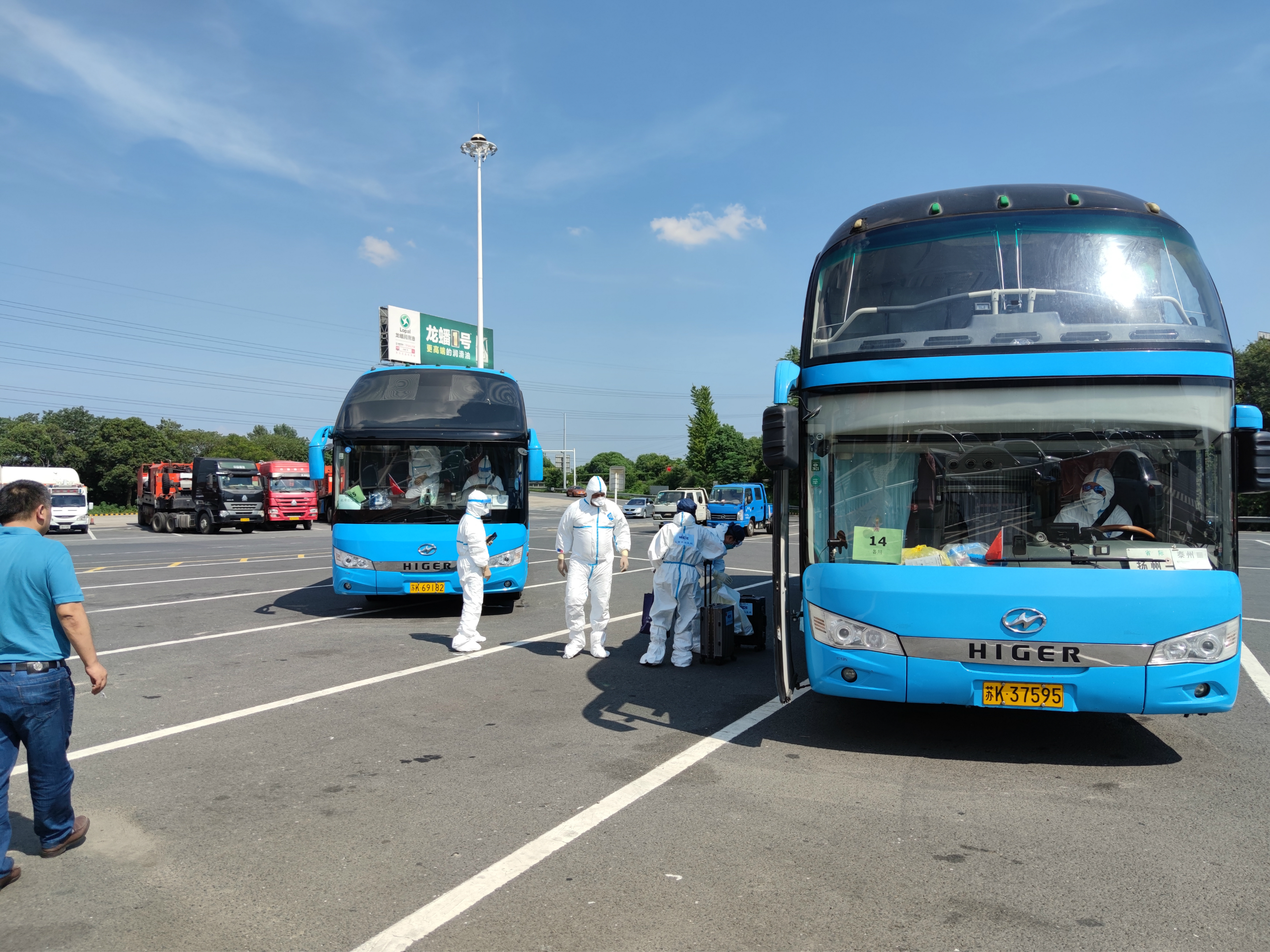 當(dāng)天氣溫達(dá)到36度,機(jī)坪溫度更是超過50度,在這種酷暑下,駕駛員全身穿戴密閉的防護(hù)服,對行車安全是巨大的挑戰(zhàn)。龔宇峰董事長趕赴現(xiàn)場,再次對駕駛員抗高溫,保安全進(jìn)行了交代。中午11時40分,首批車輛從機(jī)場出發(fā),至14時11分最后一批車出發(fā),將二百多名境外返揚(yáng)人員運送至相關(guān)酒店。16時50分,所有車輛圓滿完成任務(wù),回到指定地點,接受消毒和檢測。