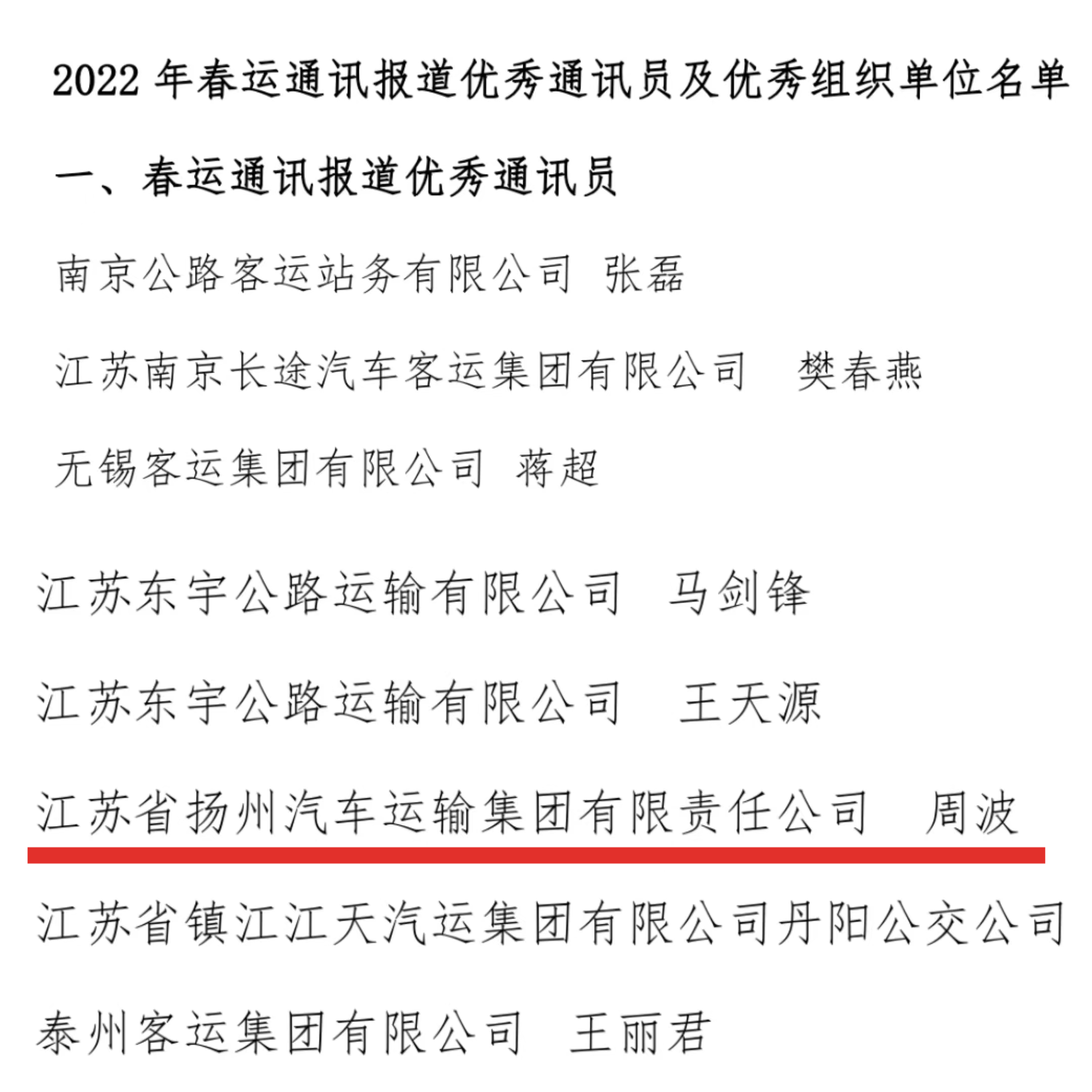 近日,江蘇省交通物流協(xié)會汽車運輸分會下發(fā)《關于表彰 2022、2023 年春運報道“優(yōu)秀通訊員”、“優(yōu)秀組織獎”的決定》,集團周波獲評“2022 年、2023年春運通訊報道優(yōu)秀通訊員”,陳思宇獲評“2023 年春運通訊報道優(yōu)秀通訊員”。