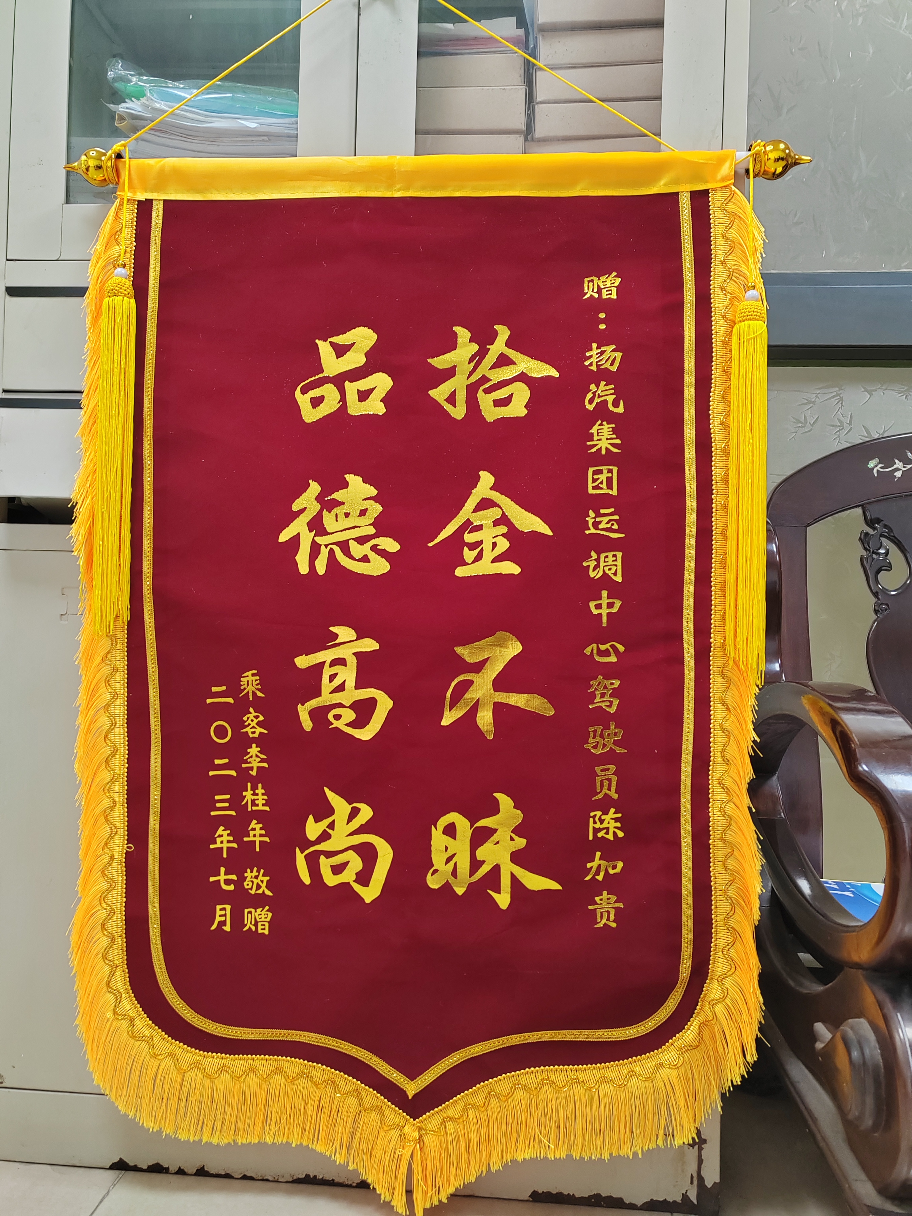 近日,江都汽車站收到了外地寄來的一面印有“拾金不昧 品德高尚”的錦旗交到了分公司相關負責人的手上,以此來表達對駕駛員陳加貴師傅拾金不昧行為的感謝。