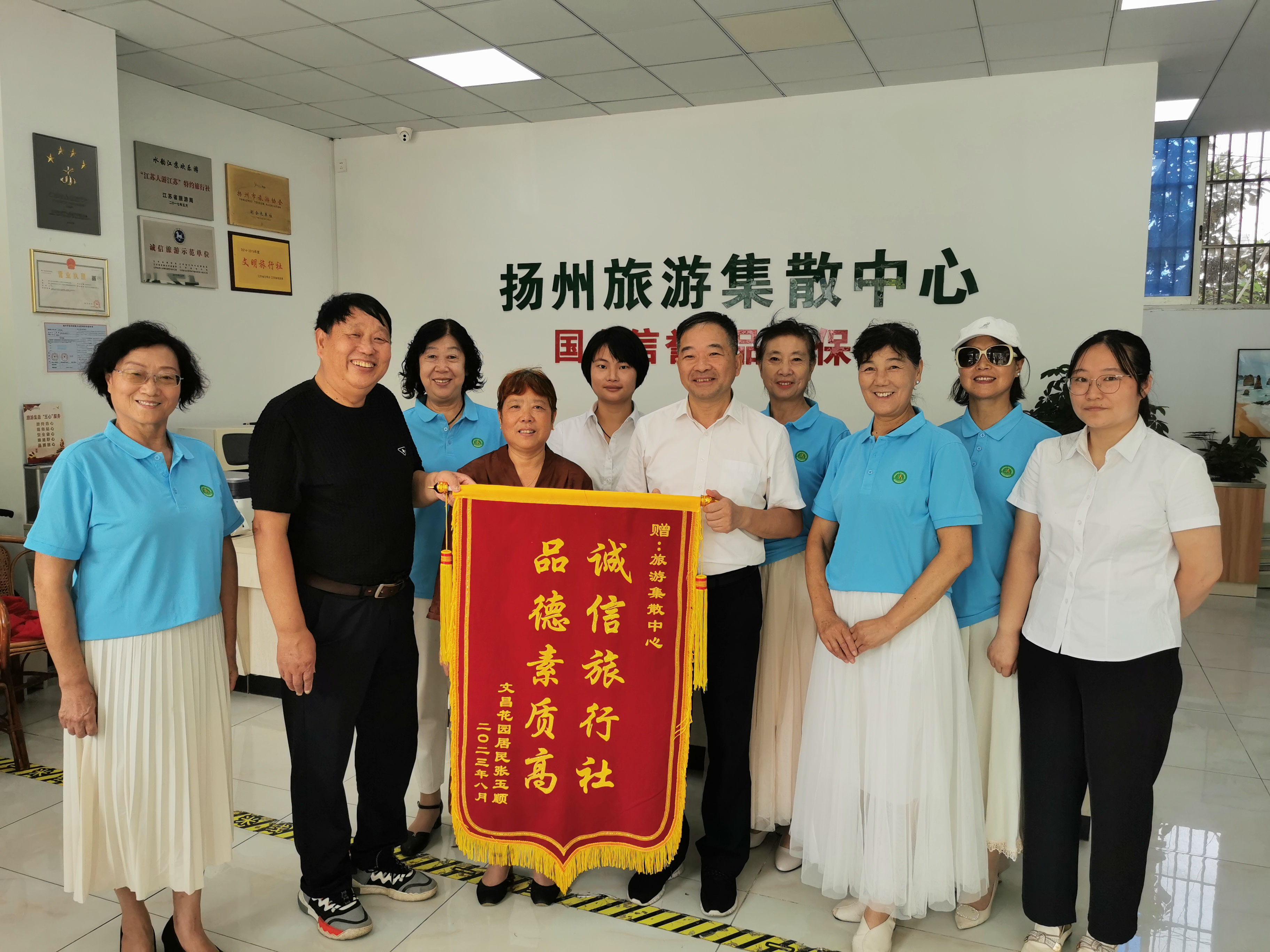 揚州旅游集散中心始終堅信只有真誠細致的服務,才會讓旅行更有溫度。“誠信旅行社,品德素質高”、“真心為民服務、傾心替民解憂”這兩面紅底金色的錦旗承載著游客對集散中心的認可,凝聚著彼此之間真情與感恩,激勵職工不斷提升業(yè)務能力,時刻為游客解憂,樹公司品牌!